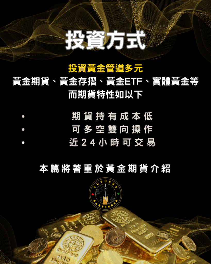 - 黃金期貨:透過期貨市場交易黃金合約,槓桿效應高,但風險與報酬也相對較大。